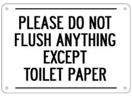 The building where you reside has old plumbing. You may only flush human excrement and toilet paper.